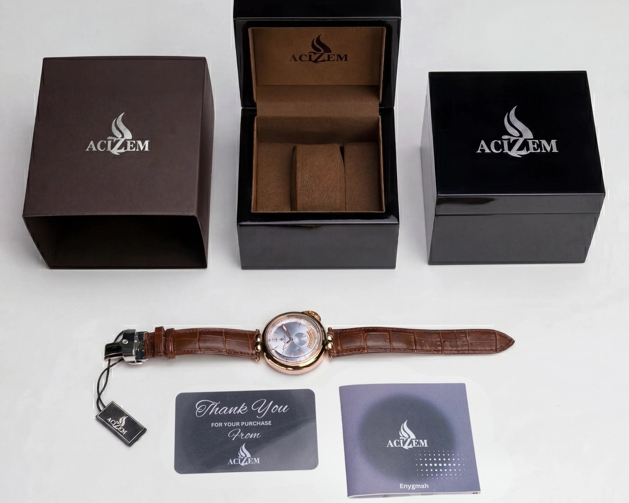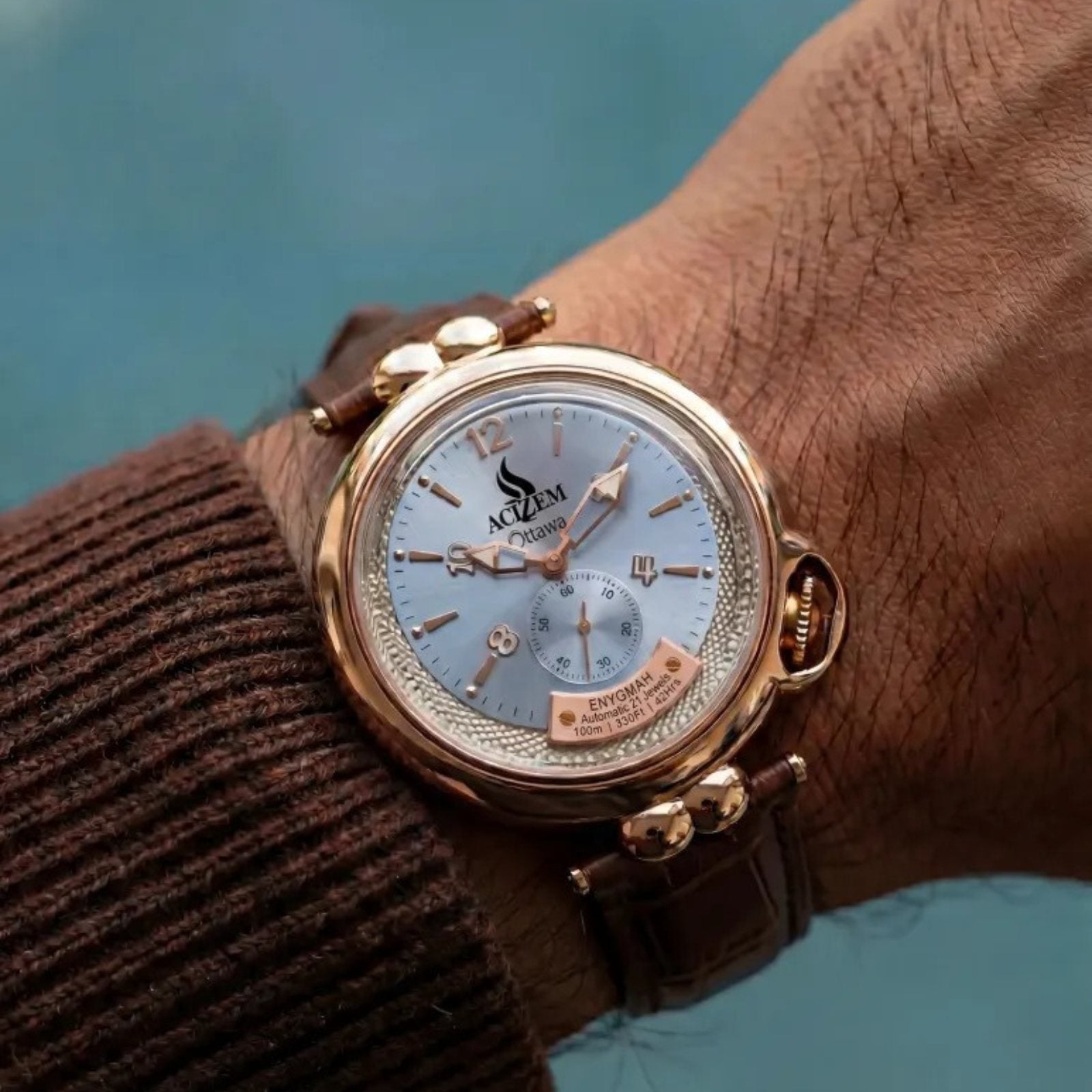 Éluu Goddiâ’s Enygmah design was born from the stories of those who left everything behind to start again. Enygmah is dedicated to those who had to run from everything they knew: cities torn by war, homes poisoned by abuse, hearts broken by loss or betrayal, and countries ravaged by inequality, injustice and uncertainty. They stepped into the unknown as a mystery, into unfamiliar lands carrying only the weight of their hopes — enigmas wrapped in courage. Over time, they found love, rebuilt careers, and redefined their identities. The Enygmah is their symbol—a watch crafted to honor the strength of becoming whole again, even in a place where you once felt unknown.